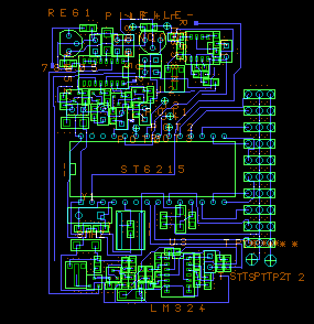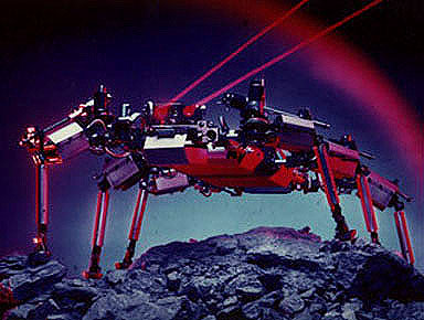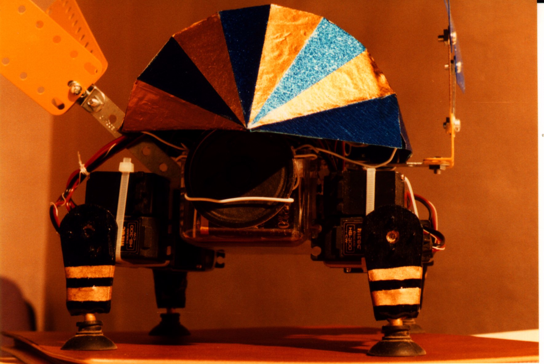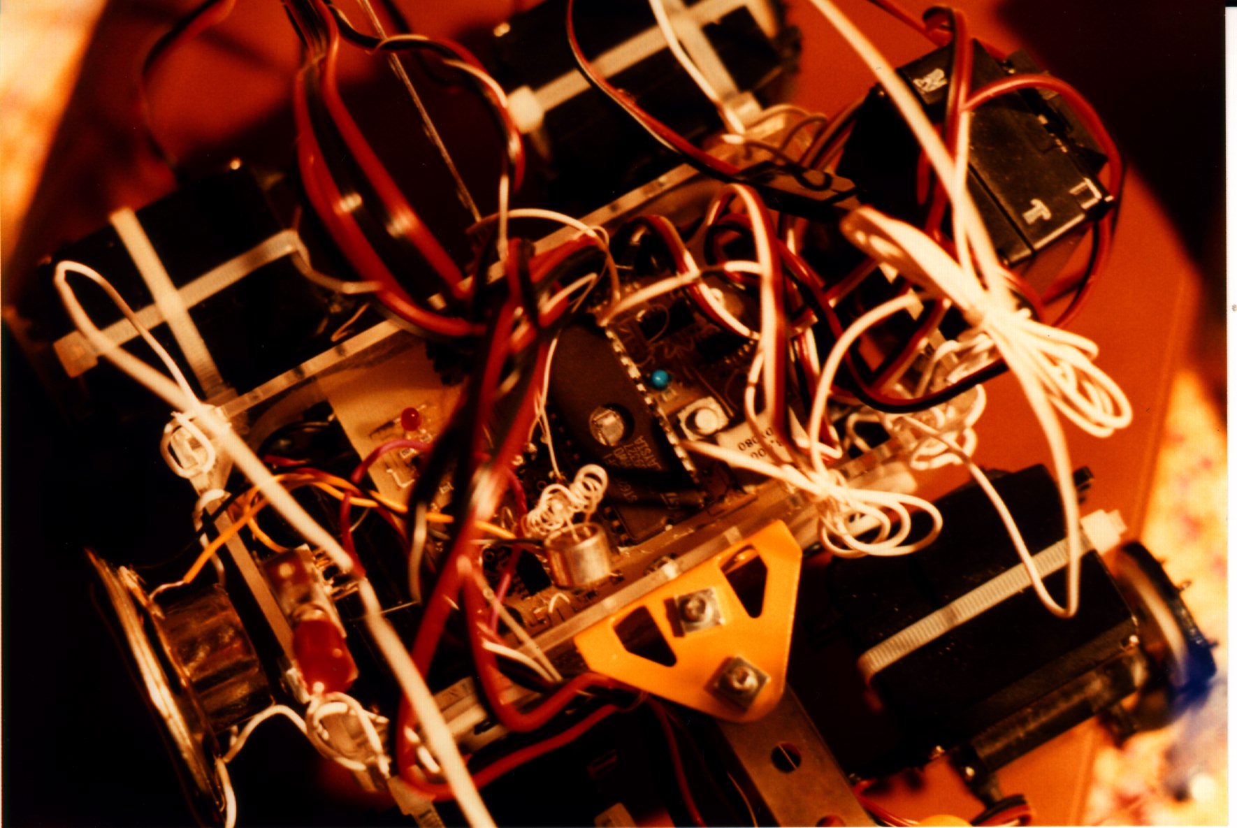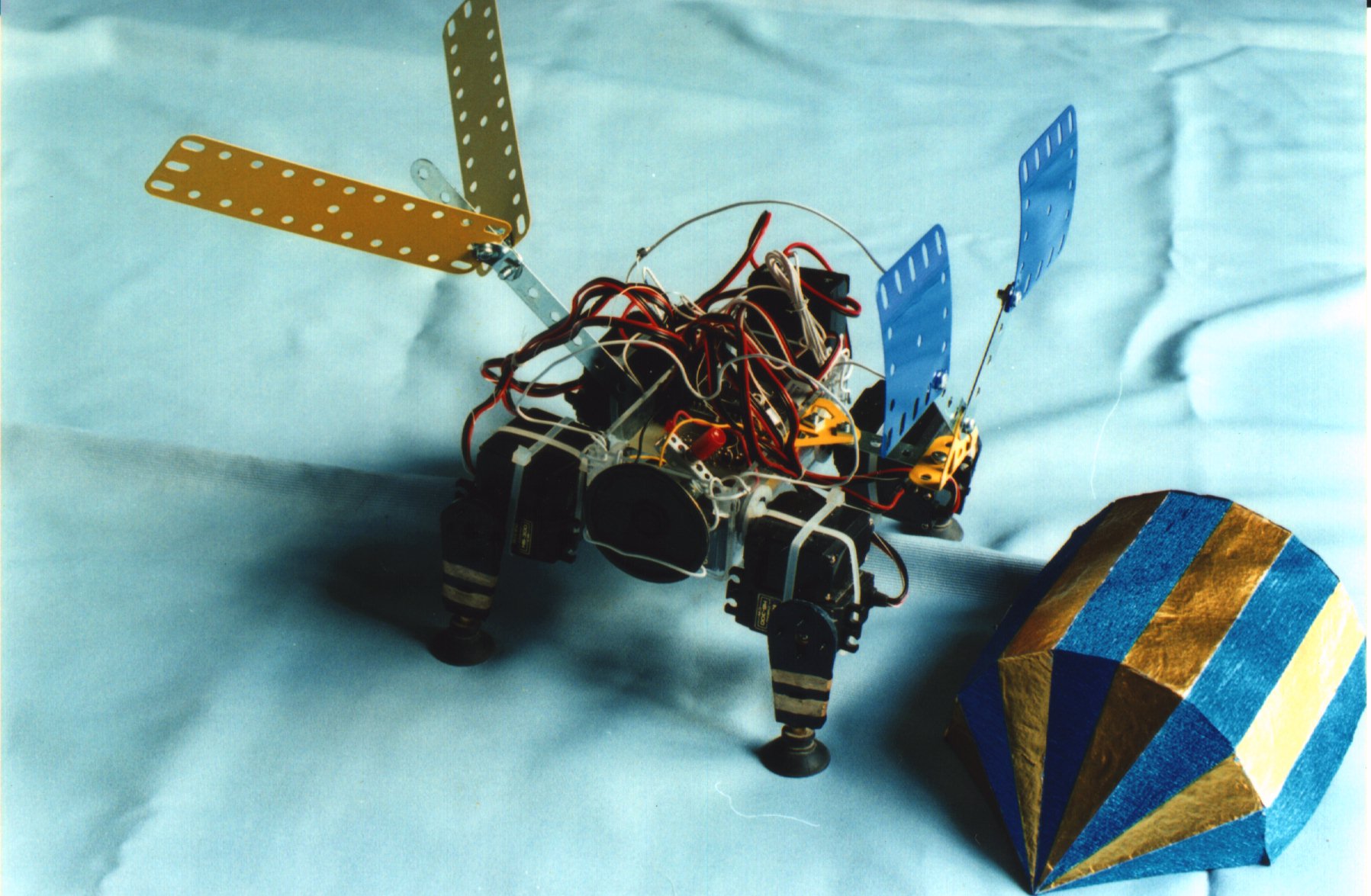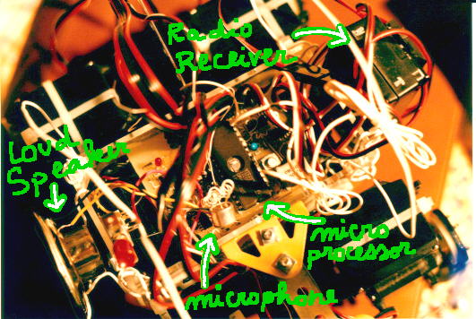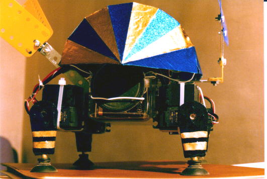 Four legs Eight Servo Controlers, Two per leg. Speed : 500 meters per hour (slighly quicker than a ant, and trust me, it runs fast) AutonomousAutonomy : 1 hour. Weight : 900g Size : 170mm x 170mm x 130mm (height) Range : 250 meters. Power consumption : 1500mA at full speed. Energy : 4 1.2V Nickel Cadmium batteries 1300mAH plus a 9V battery for Digital Parts Processor : 8 bits microcontroler ST62E25 (thomson). EPROM 4Kbytes. Source Code size about 64 kilobytes. RAM : 64 bytes ! Processing Power : About 6.5 microseconds per instruction. CPU load : 80%. Remote controlled, Radio FM receiver, needs only two channels. Eight degrees of freedom. Digital output - current amplified and sent by an analog multiplexor to Loud Speaker / Leds / Infra red Leds. Microphone / Infra red Led receivers connected to an analog multiplexor connected to an ADC input after amplification and filtering One Red Led under software control. Servos refresh rate : 50hz (this ensures optimum control) Known Illnesses : Parkinson.